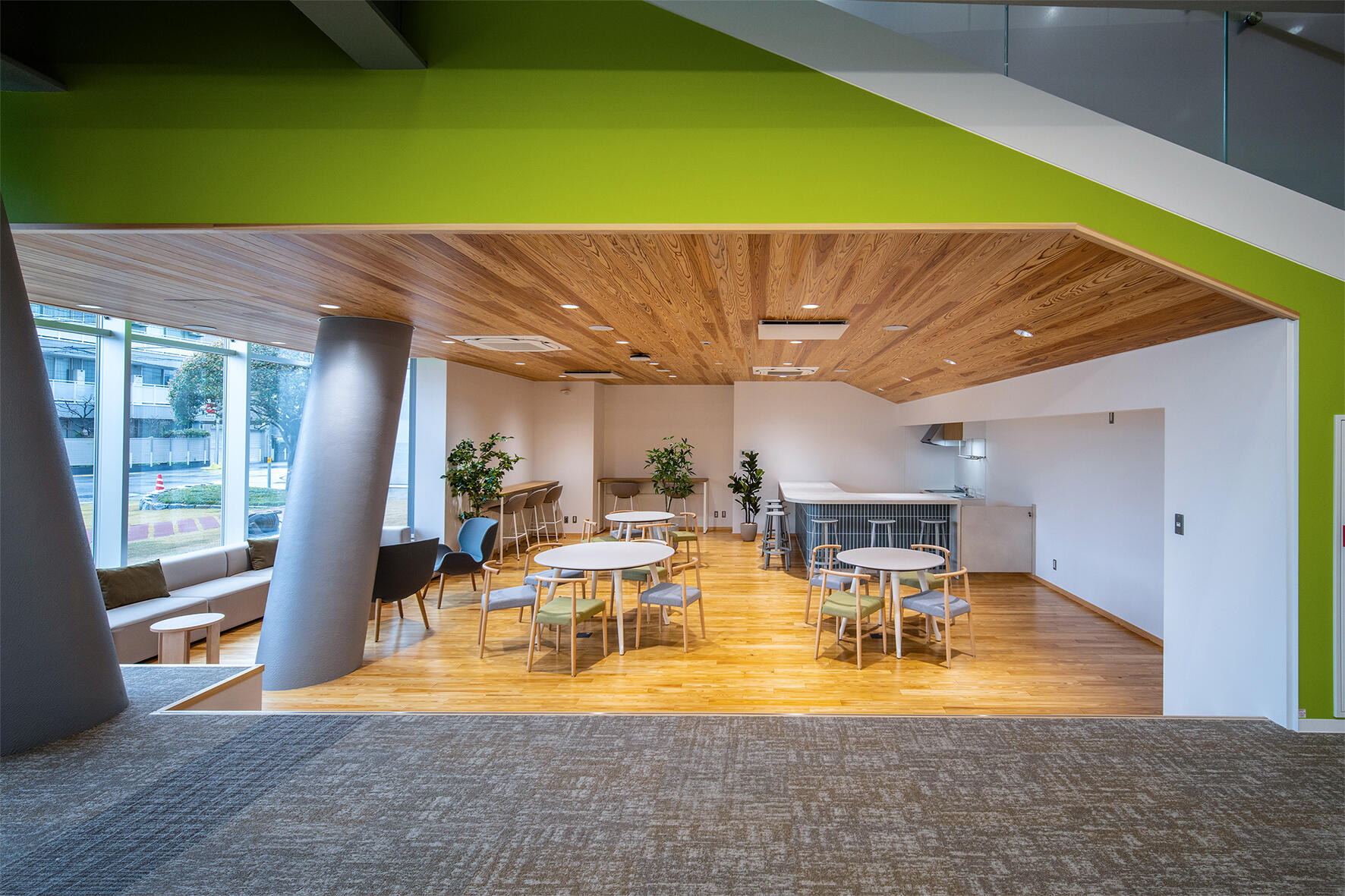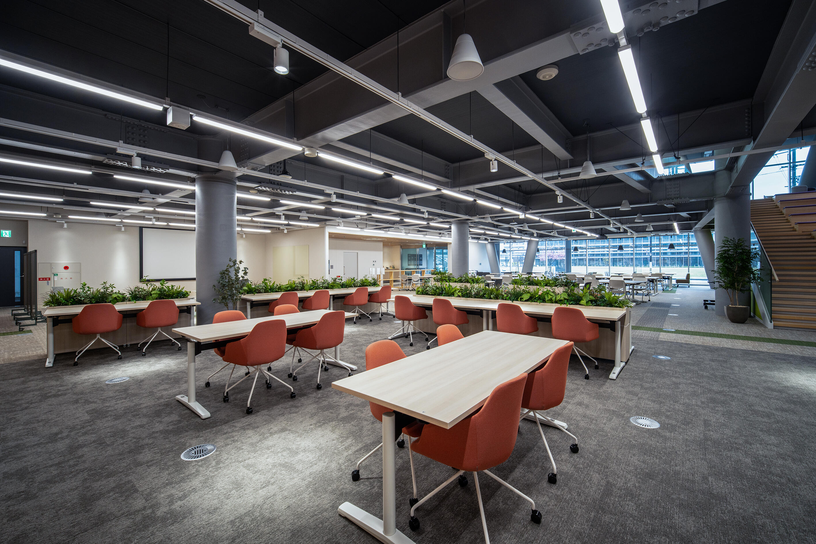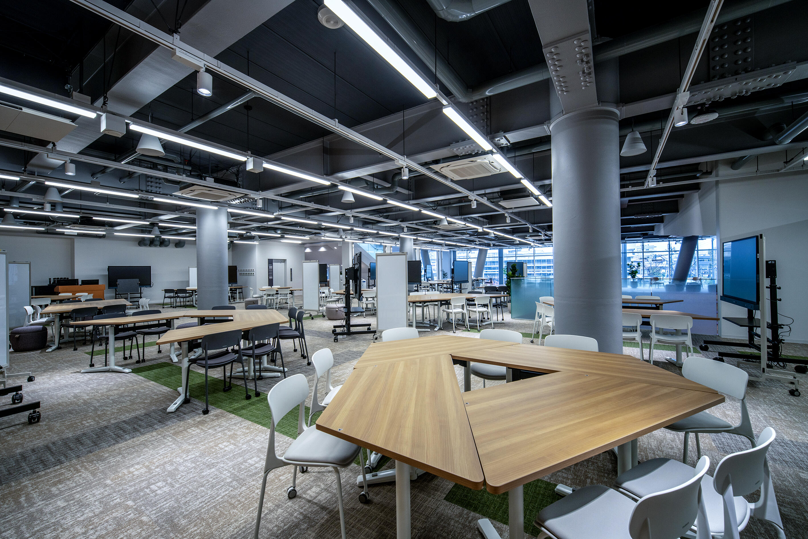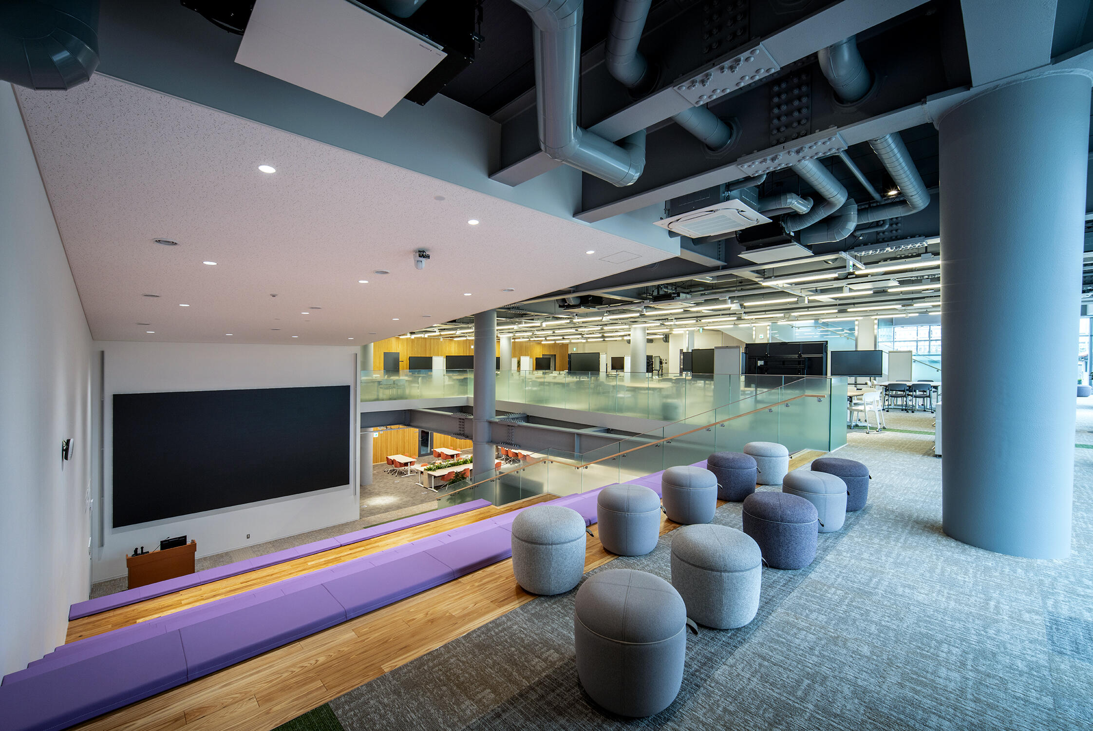 「イノベーション ラボ棟」は、データサイエンスを含む先端ICT技術を学び、有用な情報から新たな価値を創造できる文理統合型のDX人材育成・輩出の場として、産学官連携・高大連携の拠点として活用されます。データ&イノベーション学群における重要な教育の柱となるPBL(プロジェクト型実践学修:企業や団体等と連携し、実社会にある様々な課題の解決に取り組む実践教育)を円滑に行うために、講義から討議、そして実装までを1フロアでシームレスに作業転換ができるようなエリア設計としています。リグルバ(RIGRUBA) と名付けられた1階は、コワーキングスペースやXRラボに加え、ラウンジ(カフェ)を備え、イベントやセミナーにフレキシブルに対応できるプレゼンコートを含む大空間としており、地域の方々や企業等との交流の場として、全学的に使用します。2階はおもに講義で使用。3・4階は研究活動(研究室)のフロア。5階には教員室が配置されています。
