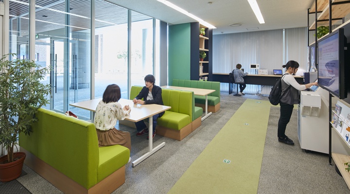 人々の交流を促すようにコモンスペースを多く設けています。教員室フロアのコモンスペースでは、教員が自然と集まって情報交換する姿が見られるほか、学生が教員に声をかけてミニ講義やディスカッションが始まることもあります。また、教育研究棟の一室にあるKUT English Learning Squareでは英語でのコミュニケーションが図れます。