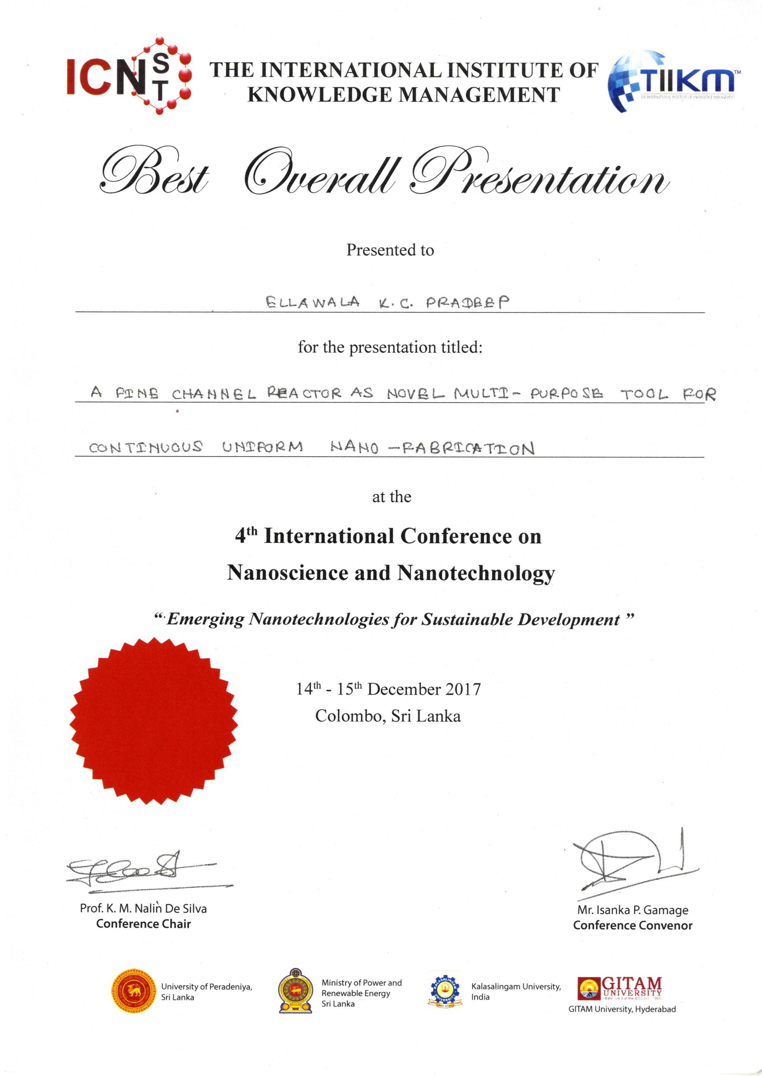 スリランカのコロンボで12月14日、15日に開催された「第4回ナノサイエンス・ナノテクノロジー国際会議(ICNSNT 2017)」において、総合研究所 Ellawala Kankanamge Chandima Pradeep 助教が、最優秀発表賞および最優秀ポスター賞を受賞しました。
