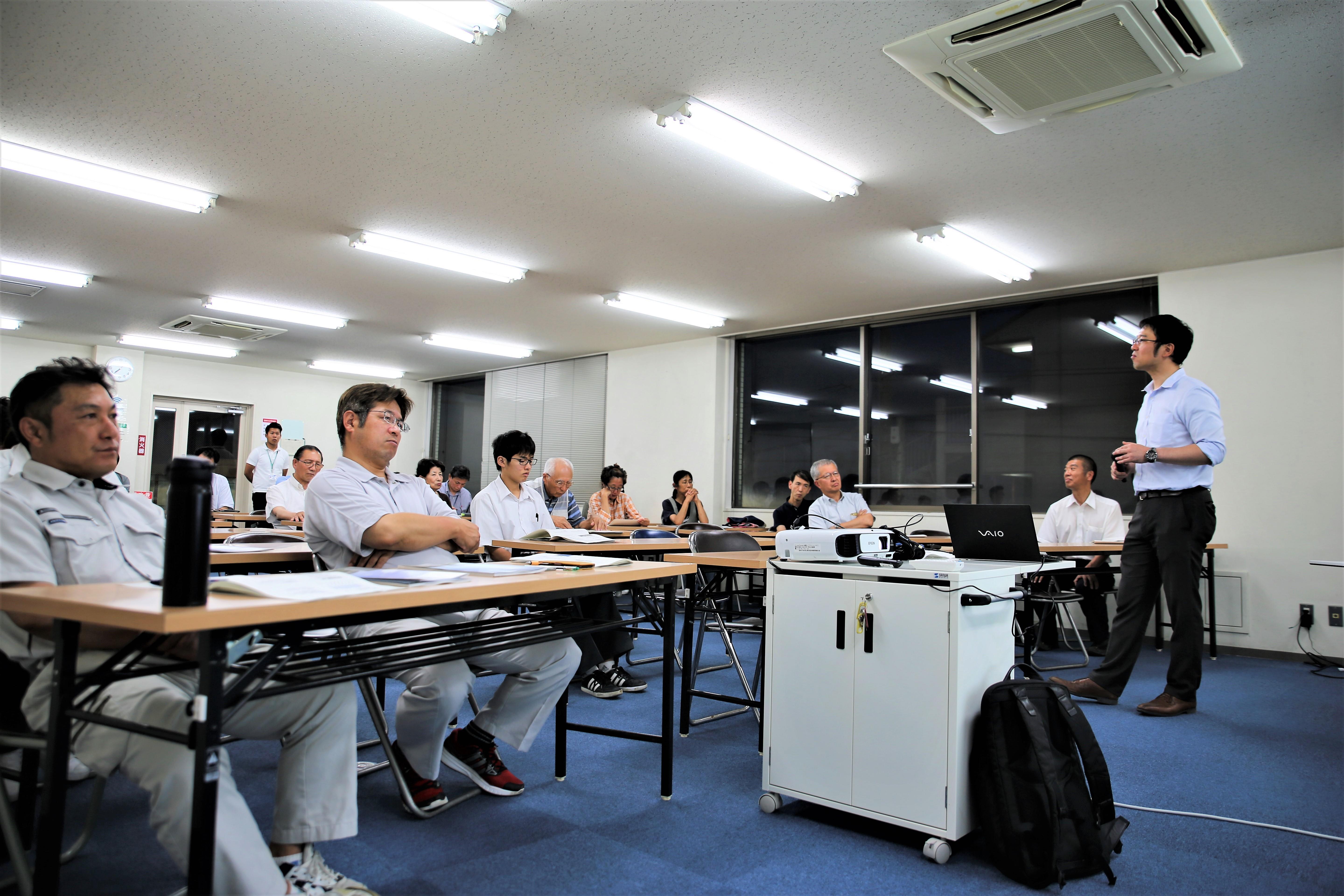 会場は、地域の方々や市役所職員、会社帰りの方、高校生等約30人が参加し、質疑応答では「人口が激減する中で、南海トラフ地震の事を考えると、将来の都市や道路の整備は難しいのでは」や「林道整備には法的な規制等があり難しいのでは」等の質問が飛び交い、また「データを取る際、高齢者を65歳以上と定義するのは改めた方がいいのでは」などの意見をいただくなど、活発に議論が交わされ有意義な催しとなりました。