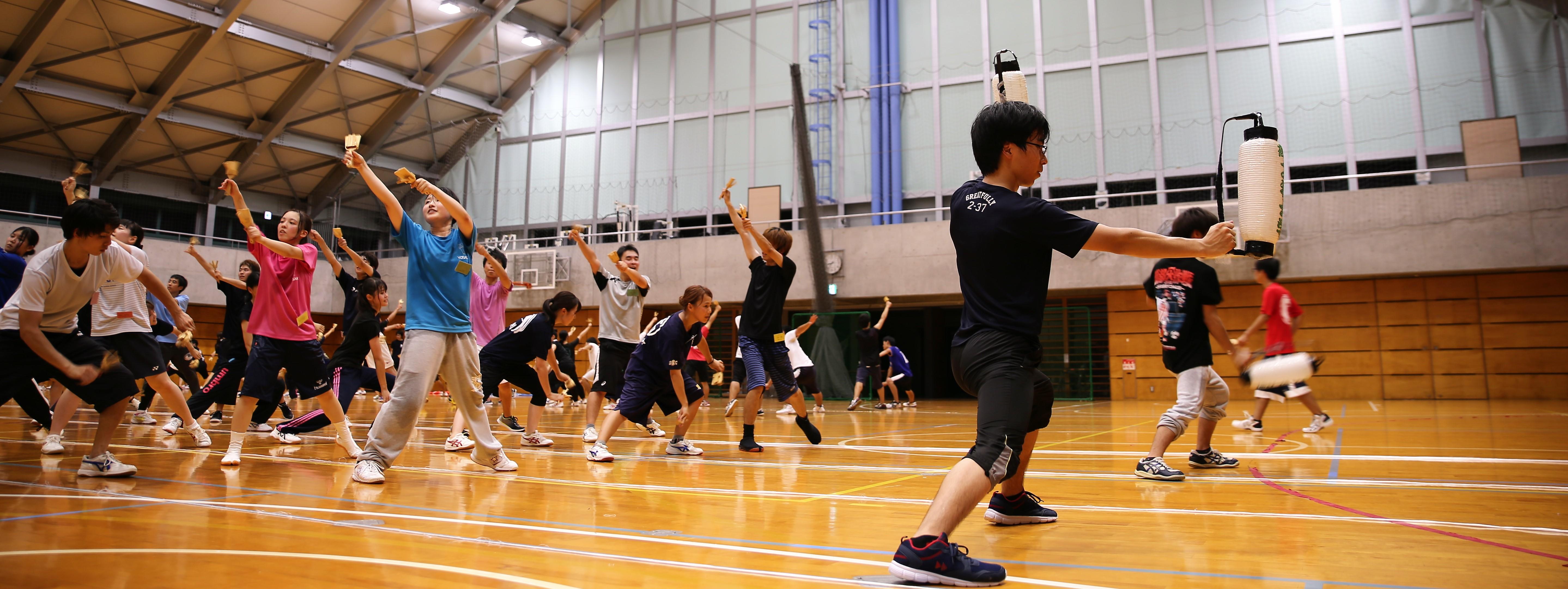 土佐山田まつりまでは2日、高知市のよさこい祭りまで練習回数はあと3~4回となり、「高知工科大学よさこい踊り子隊」の踊りの練習が、終盤にさしかかってきました。体育館全面を使い、隊列の最終チェックや躍り込みをして本番に備えていきます。