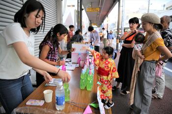 商店街の沿道には学生が企画販売するラムネや冷やしフルーツ、かき氷、射的や輪投げなど7つの出店が並びました。