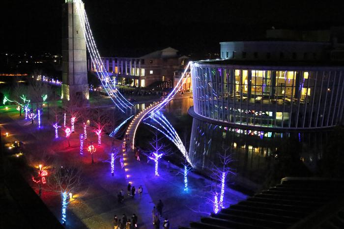 香美キャンパスの景観を生かし、約3万個のLEDを使用して彩るキャンパスイルミネーションは今年で16回目を迎え、テーマを「光のアクアリウム」としています。 ガラス張りの図書館と池の水の反射を利用したシャドーアート、片地小学校児童たちが描いたペーパーバックに灯をともし、かわいらしく暖かく浮かび上がるクリスマスイベント限定の装飾も通常のイルミネーションに加え華を添えました。