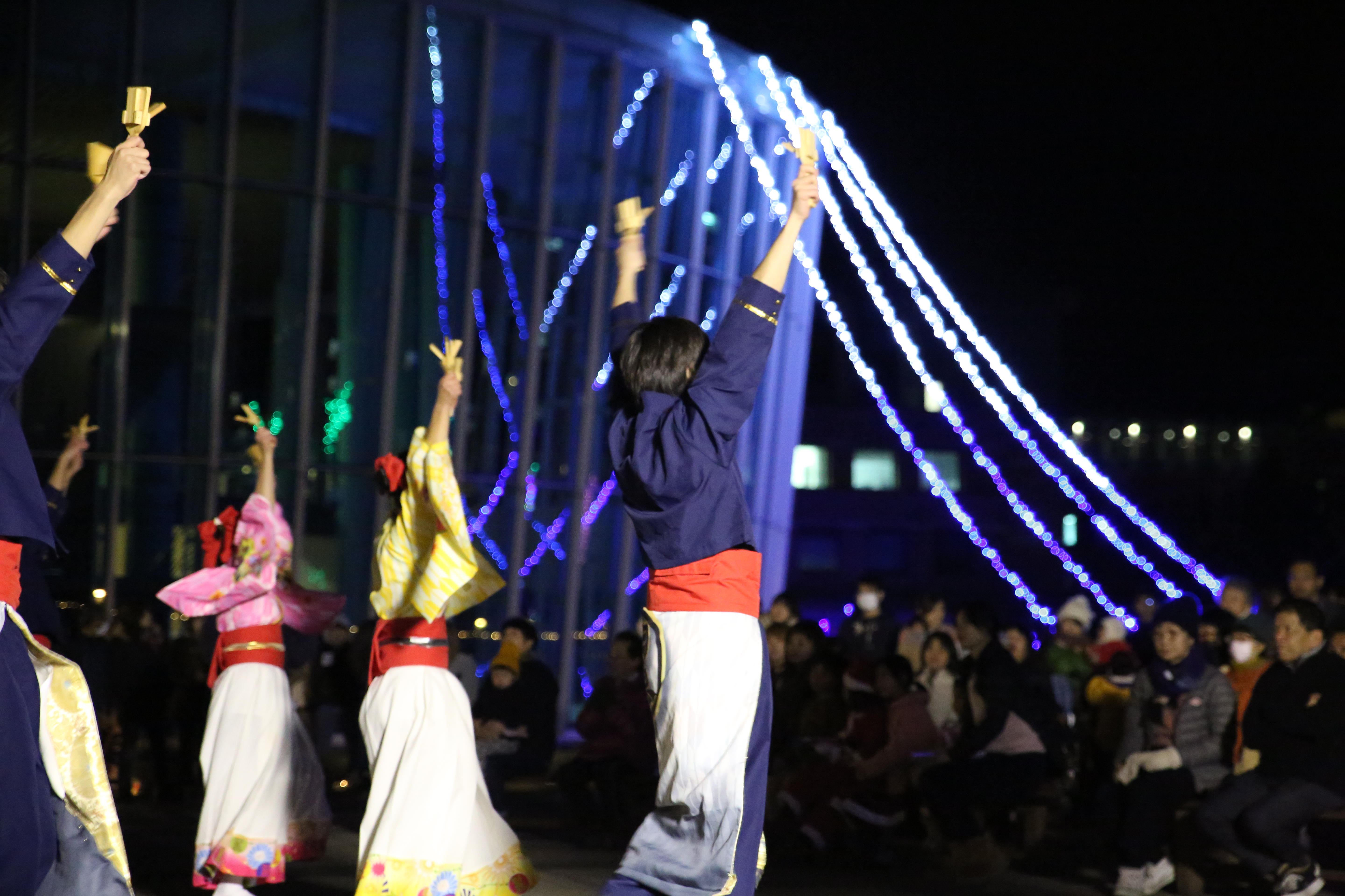 メインのイベントが披露されるセントラル池近くの講義棟付近では、学生団体によるよさこい踊りの演舞やピアノ同好会、JAZZ研究会などによるクリスマスムードを演出する歌や音楽が、普段の静かな夜のキャンパスとは違った華やかさを演出し、楽しいさまざまなパフォーマンスに拍手が沸き起こりました。
