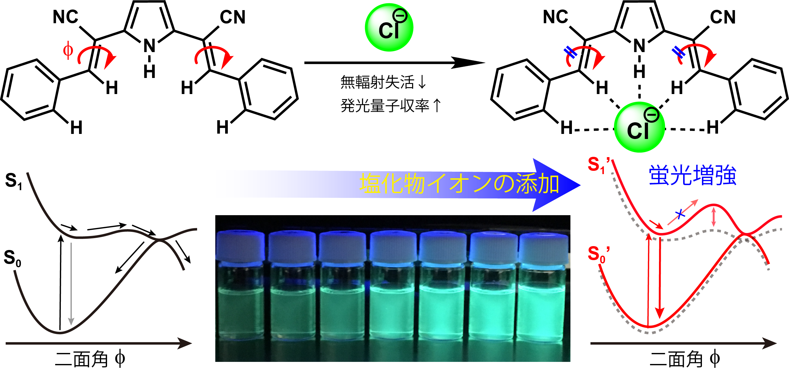 本論文は、開発した独自の分子骨格を用いて、陰イオンを捕捉した分子の動き、つまり熱運動が抑制されることで、蛍光強度が大きく増強するメカニズムを、理論化学的、実験的に明らかにし、可視化の可能性について解説しています。