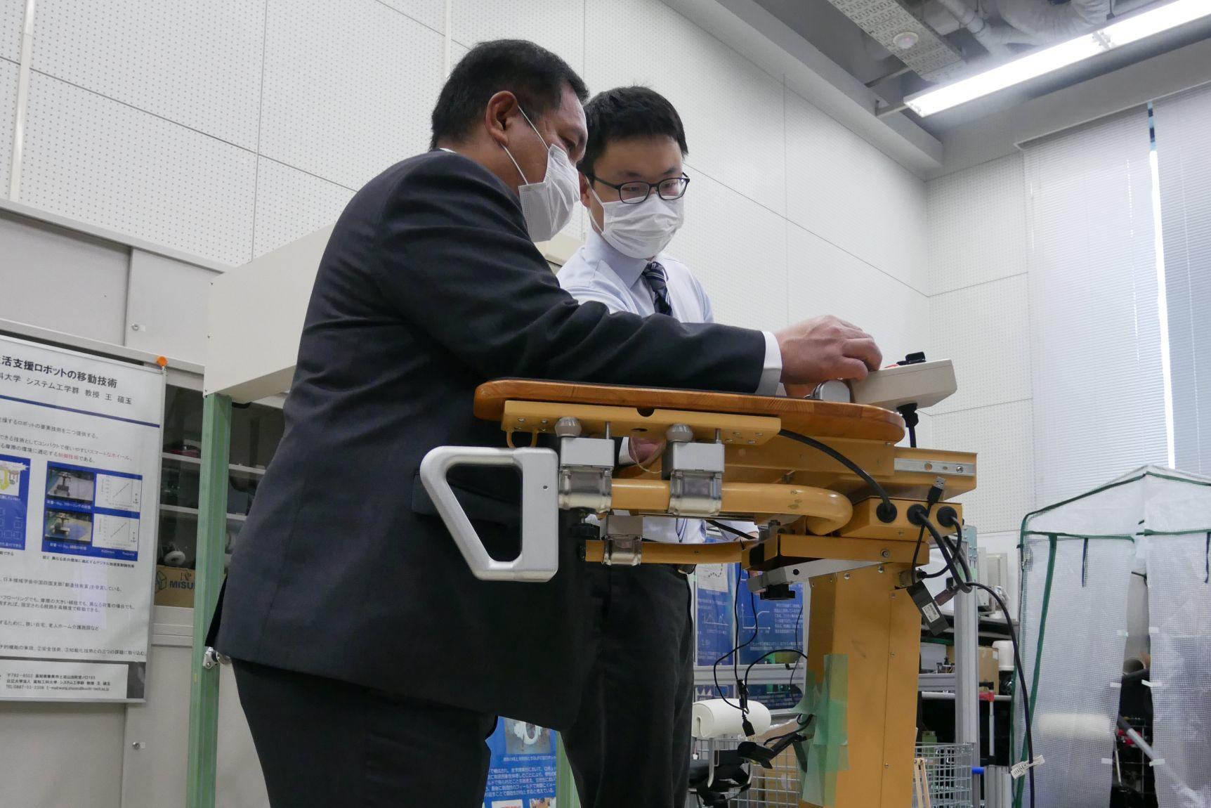 調印式後、一行は香美キャンパスの研究室見学を行い、吉田 真一教授(情報学群)の知能情報学研究室、堀澤 栄教授(理工学群)の森林資源学研究室で研究内容の説明に熱心に耳を傾けていました。また、古田 守教授(理工学群)からはクリーンルームで最先端の研究施設を使った研究事例の紹介を、知能ロボティクス研究室では、Yang Guan助教(システム工学群)による、歩行支援ロボットを作動させた体験型の研究室見学を行いました。