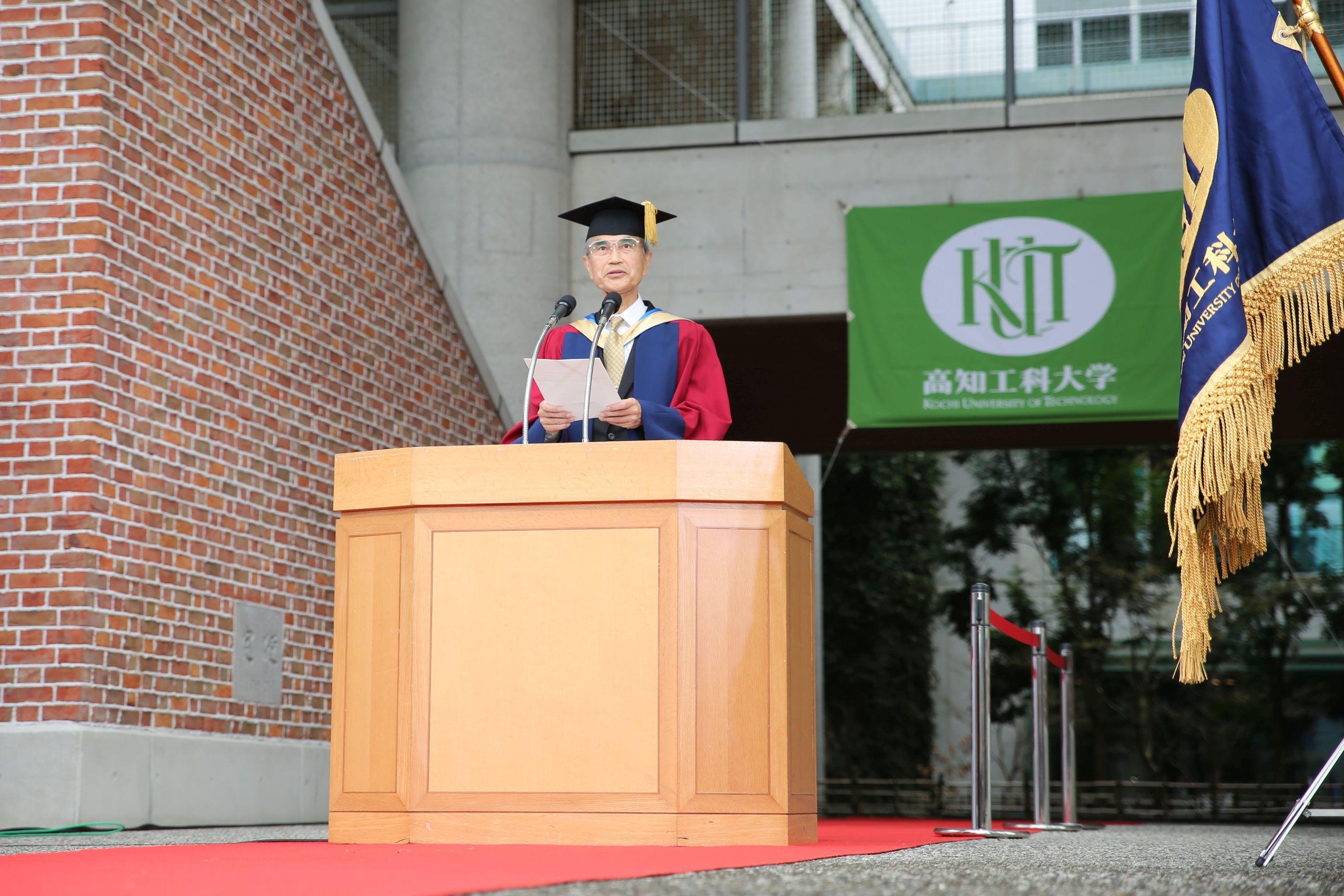 任期満了に伴い今年度末で退任する磯部 雅彦学長は卒業生に向けて「現在を生きる人間には、差し迫った数々の問題を解決し、社会や自然環境を持続可能なものとして、次世代に引き継ぐ義務があります。と言っても、自然や社会の微妙なバランスの中で、持続可能な社会を築くことは生易しいことではありません。その中で、皆さんが培った能力は、それぞれにこの目的に向けて大きな貢献をすることができると思います。是非、皆さんの能力をどのように生かしたらよいのか考え、貢献していただきたいと思います。ただし、持続可能な社会は、必ずしも各個人の幸せの実現を保証するものではありません。私たちはそれぞれが、持続可能な社会づくりへの貢献とともに、各人の幸せに向けた人生の選択との、二面を持ち合わせているのだと私は思います。皆さんには、社会の一員として持続可能性を追求しつつ、自身の内面に向かっては各人が最高の人生を全うして欲しいと切に願っています」とエールを送りました。