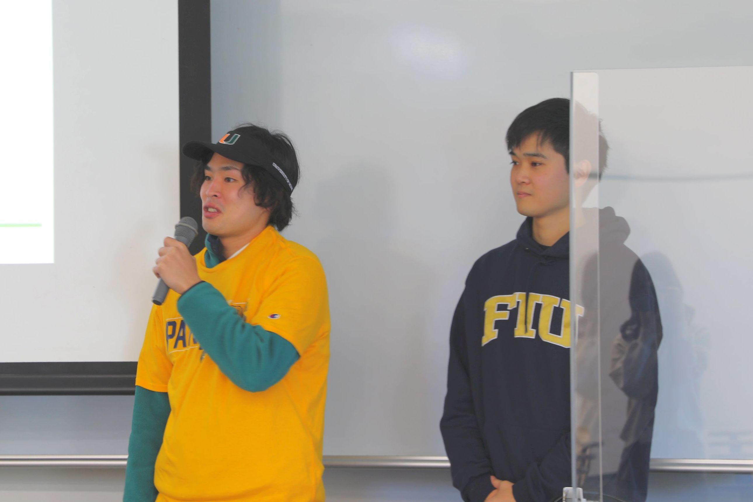 (フロリダ国際大学とマイアミ大学のグッズを身に着けて話す田口さん(左)と生田さん(右))