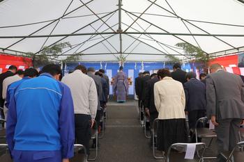 伊藤 博明理事長、蝶野 成臣学長をはじめとする本学の関係者、施工業者の方々など約40名が出席。天候に恵まれた晴天の中、来月から始まる建設工事の安全を祈りました。